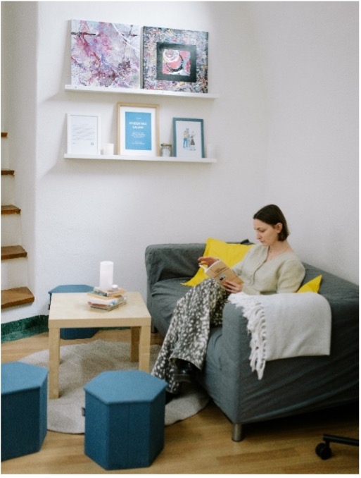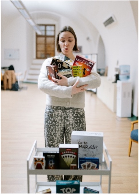• najdeš komunitní knihovničku a galerii i chill zónu s deskovkami