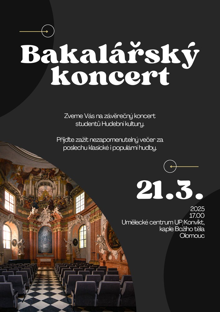 Studentky a studenti 3. ročníku, Bc. studijního programu Katedry hudební výchovy PdF čeká v rámci předmětu Řízení sboru Bakalářský koncert. Přijďte je podpořit, budou jistě skvělí!