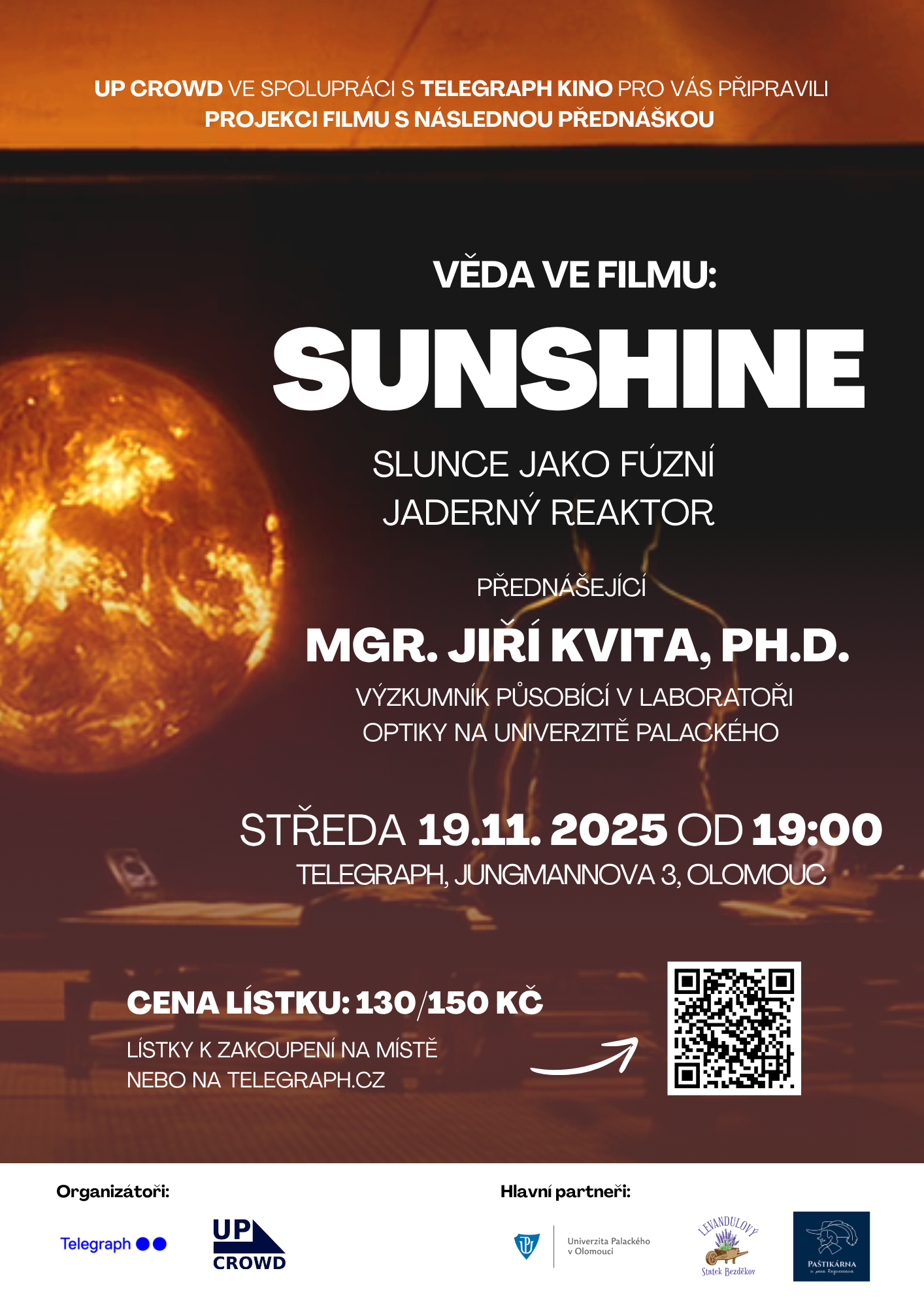 Co kdyby Slunce najednou přestalo svítit? Film Sunshine ukazuje dramatickou misi, která má hvězdu zachránit. Po filmu však nastoupí realita: Mgr. Jiří Kvita, Ph.D., vás provede světem skutečné jaderné fúze, vysvětlí, jak Slunce opravdu vyrábí energii, kolik jí denně ztrácí, a proč neutrina cestují přímo k nám. Připravte se na večer plný napětí, vědy a fascinujících objevů, které ukazují, že realita někdy překoná i sci-fi.