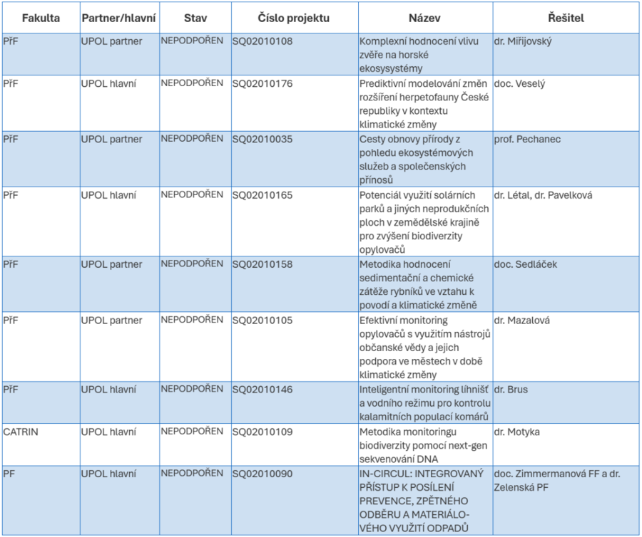 Za UP bylo podáno 9 projektů, v pozici hlavního řešitele 5 z nich. Neuspěl však ani jeden z nich.