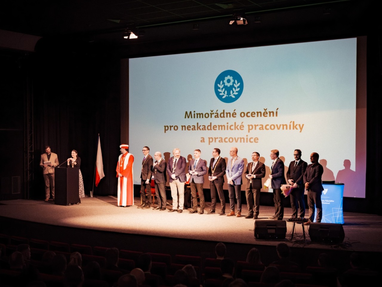 Správce počítačové sítě, vrátné, údržbář, uklízečka, účetní, asistentky prorektorky či děkana, referentka welcome pointu, odborný pracovník ve zdravotnictví nebo vedoucí správy budov vystoupili na podium kina Metropol a z rukou hlavních představitelů UP obdrželi diplom a medaili jako uznání za svou práci a přínos pro univerzitu.
