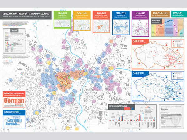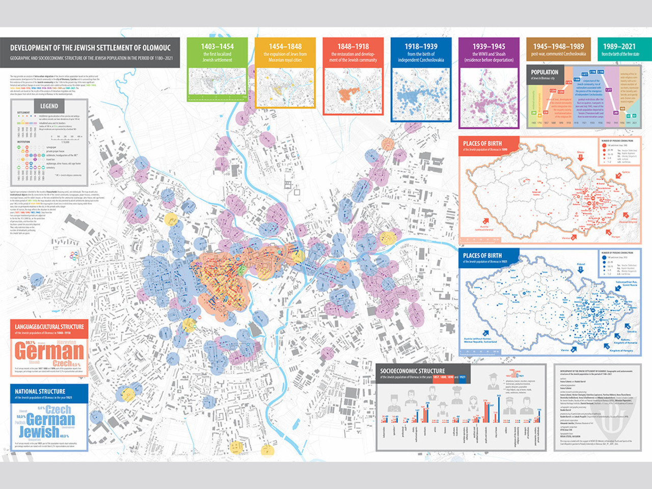 The map The Development of Jewish Settlement in Olomouc: The Geographical and Socioeconomic Structure of the Jewish Population in the Period 1180–2021 (VUP, 2022) was created with the support of the Ministry of Education, Youth, and Sports of the Czech Republic (project IGA_FF_2021_026). It is available in both print and digital formats on the website of the Center for Jewish Studies at the Faculty of Arts, Palacký University.
