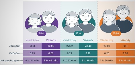 Czech children and teenagers are experiencing a gradual reduction in sleep duration. On weekdays, they spend an average of 7 hours and 57 minutes sleeping. Since the last data collection in 2018, the sleep duration of children aged 11–15 has decreased by 11 minutes. Compared to national data from 2014, the difference is already more than 20 minutes. This means one in two school children (49%) are sleeping less than the recommended minimum, whereas in 2014, only 35% of schoolchildren fell into this category.