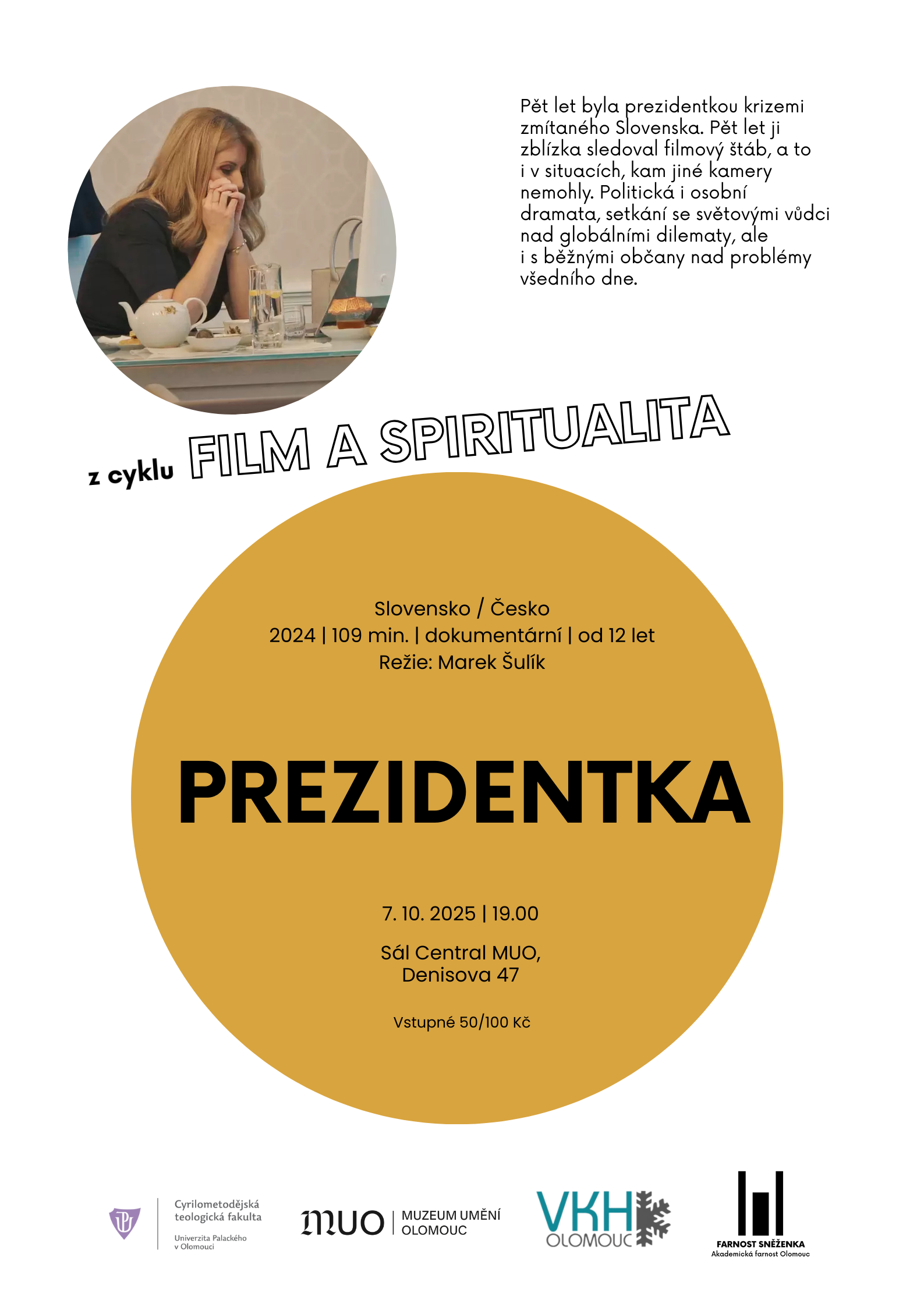 Promítání filmu Prezidentka z cyklu Film a spiritualita, po filmu následuje diskuze. Vstupné na film je 50/100 Kč.