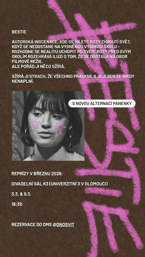 Divadelní spolek DNOSVIT uvádí autorskou inscenaci, v níž se mísí krize mladého věku s agresivním odhodláním a sem tam nějakou tou bublinkou.