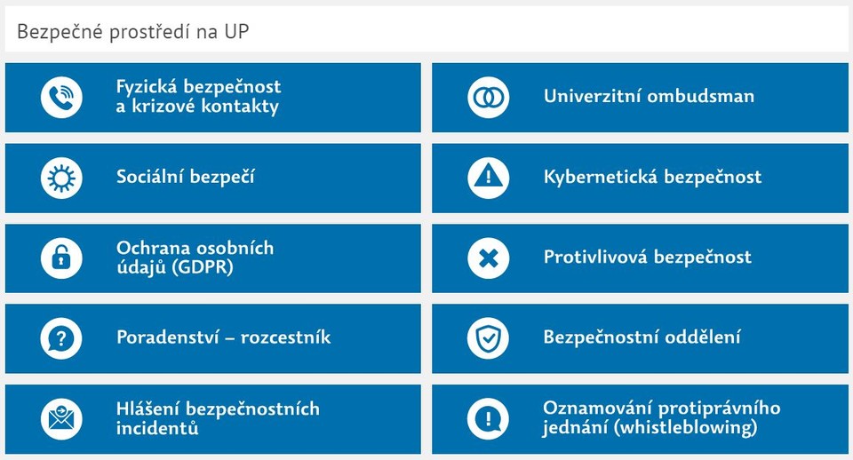 K Bezpečnému prostředí na UP se nově dostanete jednoduše z menu na hlavním webu univerzity. Rozcestník, kterému dominuje fyzická bezpečnost, navede uživatele také k univerzitnímu ombudsmanovi, na problematiku kybernetické bezpečnosti či na rozcestník univerzitního poradenství.