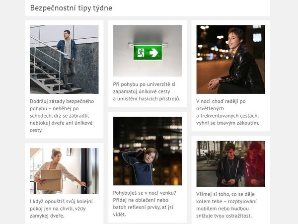 Cestuješ do zahraničí? Měj kopii dokladů v mobilu nebo uloženou jinde než originál. nebo Při pohybu po univerzitě si zapamatuj únikové cesty a umístění hasicích přístrojů. Zdají se vám tyto „poučky“ samozřejmé? Přesto si na webu Bezpečné univerzity můžete pro zajímavost projít databázi Bezpečnostních tipů týdne, každý týden se o jeden rozšiřuje.