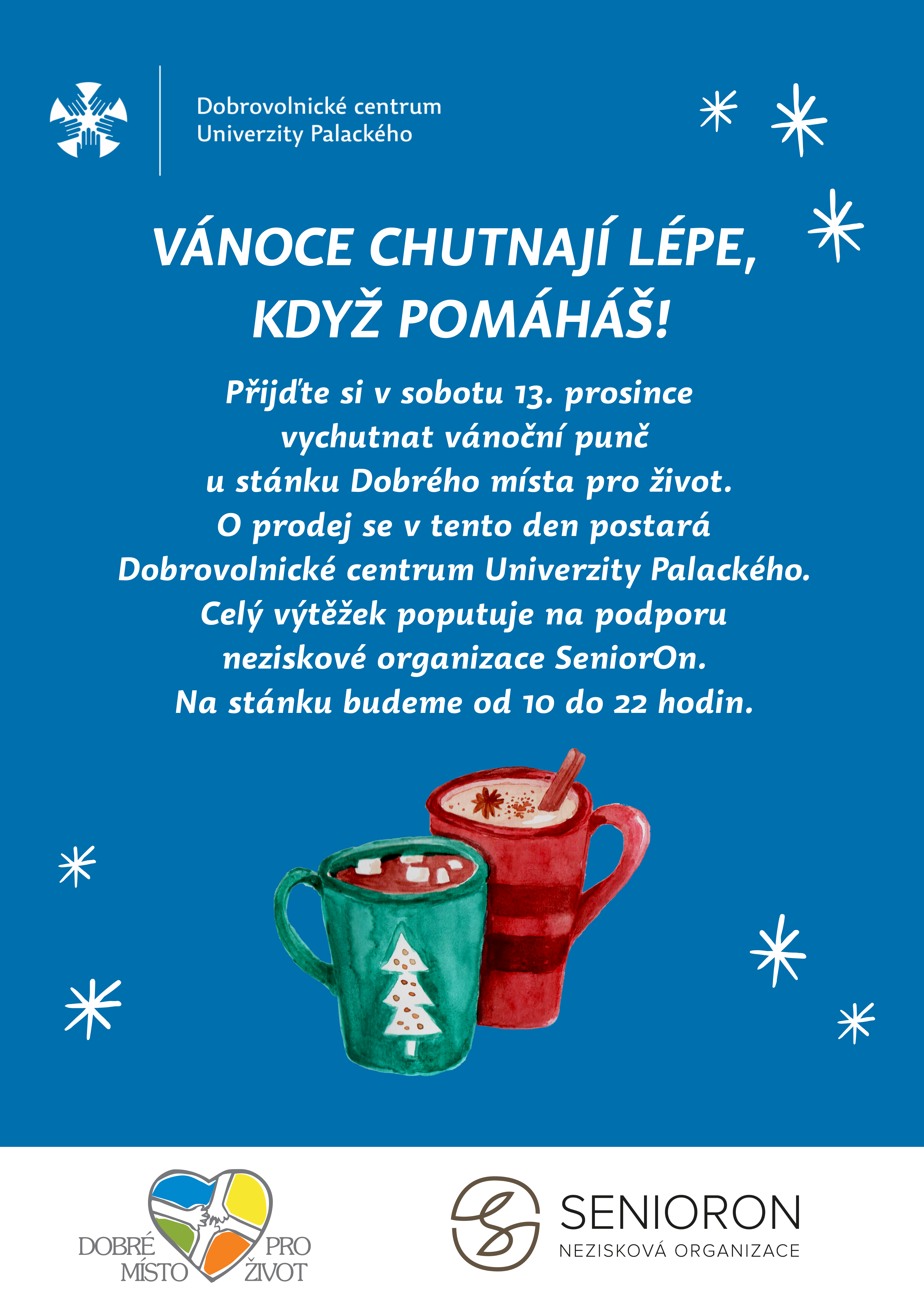 Dobrovolnické centrum Univerzity Palackého se v letošním roce připojuje k prodeji (dobro)punče ve stánku Dobrého místa pro život. Podpořit naše úsilí můžete u stánku na Horním náměstí v sobotu 13. prosince 2025.