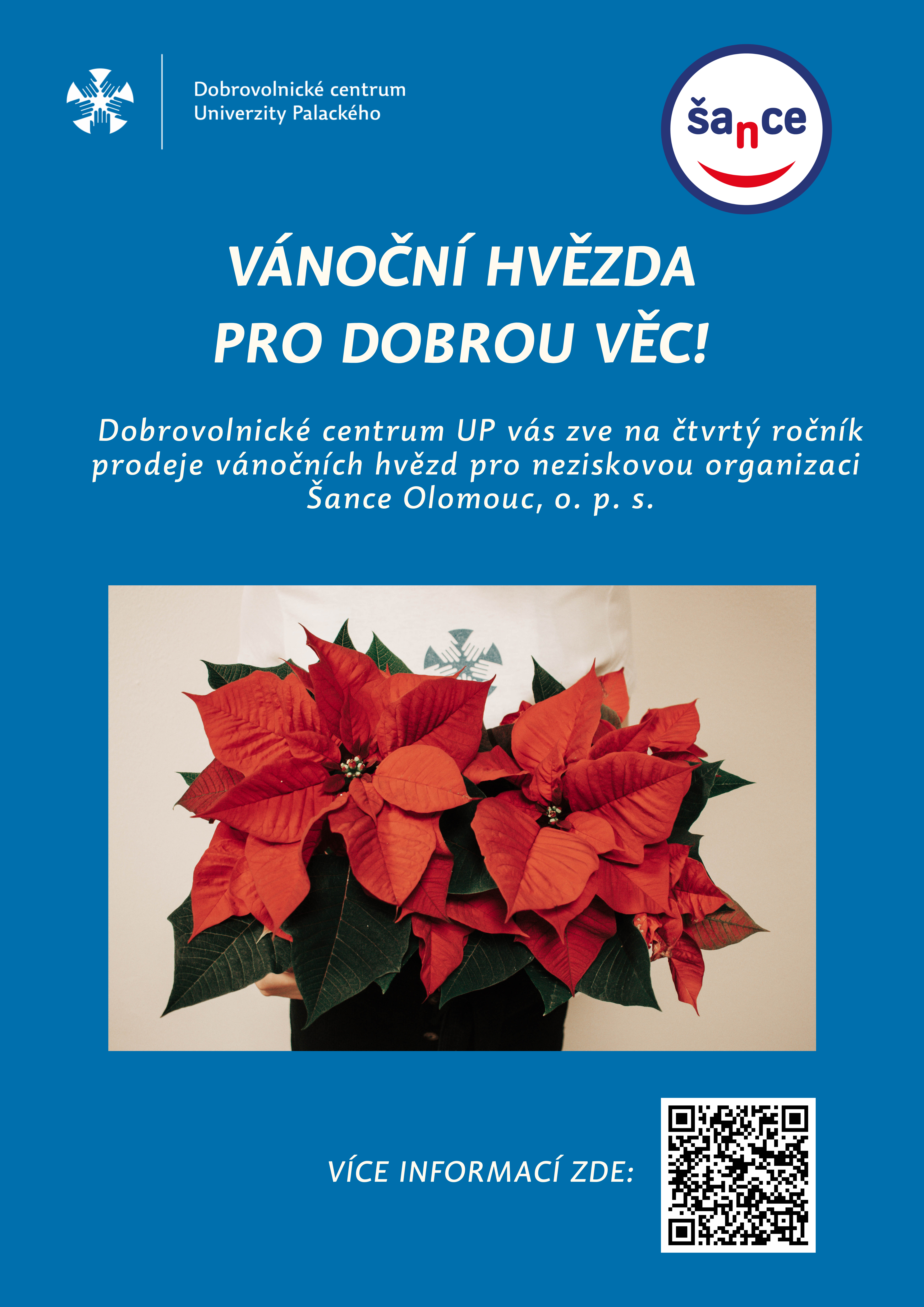 Dobrovolnické centrum UP vás zve na čtvrtý ročník prodeje vánočních hvězd pro neziskovou organizaci Šance Olomouc, o.p.s., který letos bude na Univerzitě Palackého probíhat od 1. do 4. prosince 2025.