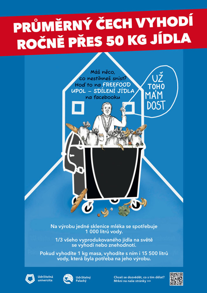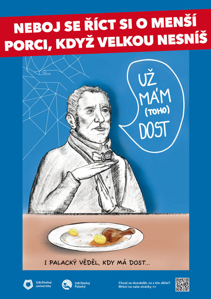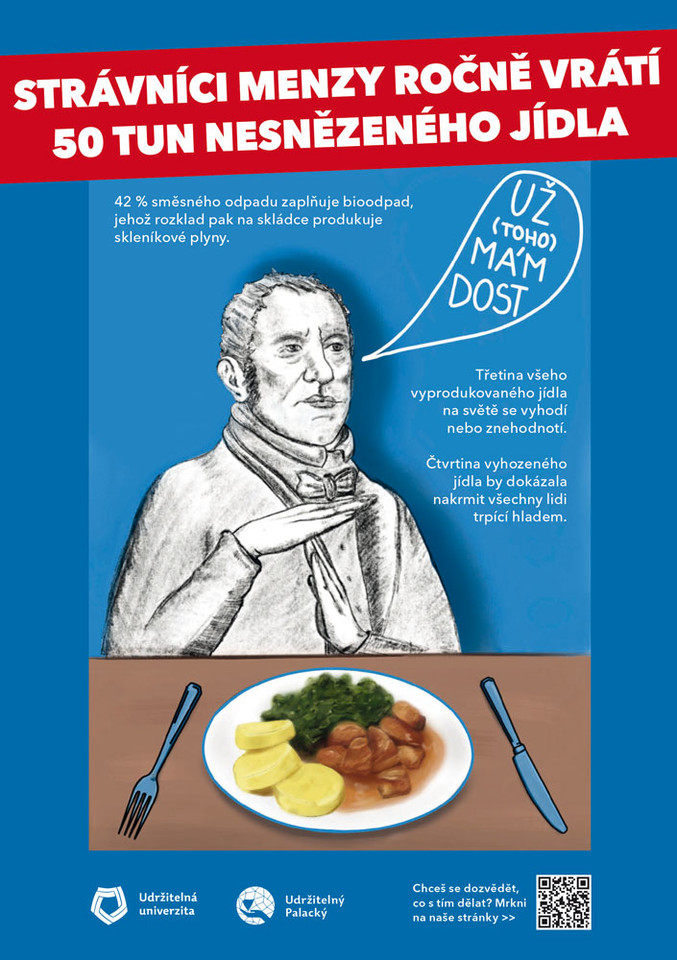 Průměrný Čech vyhodí ročně 50 kg jídla, hmotnost nesnězeného jídla v menzách Univerzity Palackého se pak za celý rok pohybuje okolo 50 tun. Změnit to má právě započatá kampaň, za níž stojí studentský spolek Udržitelný Palacký a Udržitelná univerzita. Plakáty s motivem Františka Palackého nabádají studenty a zaměstnance k zodpovědnějšímu přístupu k potravinám jak v univerzitních menzách, tak ve vlastních lednicích a spížích.
