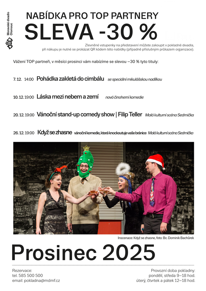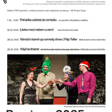Moravské divadlo Olomouc zve na rodinné představení Pohádka zakletá do cimbálu s živou romskou cimbálovou muzikou nebo na humornou vánoční stand-up comedy show komika Filipa Tellera, která naladí na sváteční atmosféru.