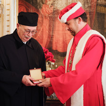 Representatives of the university then presented Karel Eliáš with an honorary doctorate in the form of a diploma and a commemorative UP medal with a double portrait of Josef Dobrovský and František Palacký.