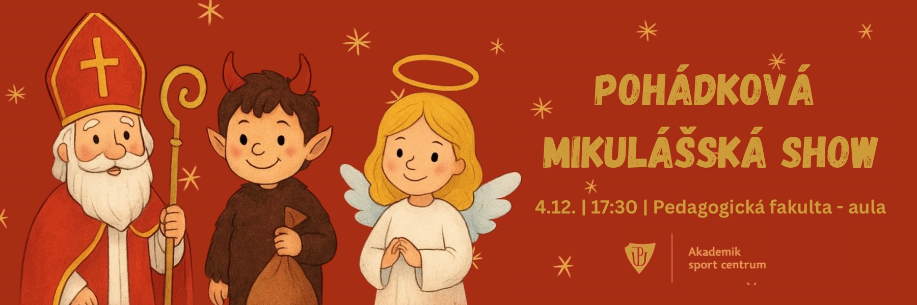 Univerzitní pohádková mikulášská showByly vaše děti celý rok hodné? I když nebyly, nevadí – i tak je můžete vzít na univerzitní mikulášskou show Akademik sport centra UP ve čtvrtek 4. prosince. Vstup je zdarma, ale musíte se přihlásit. Pro děti si můžete objednat balíček s dobrotami v hodnotě 250 Kč, případně si můžete přinést svůj vlastní balíček. |