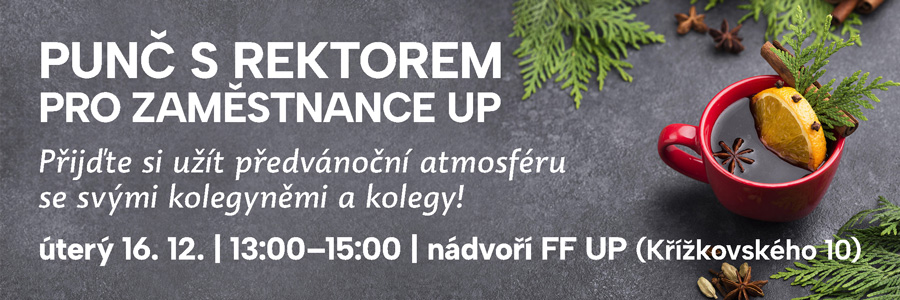 Přijměte pozvání na punč s rektoremRektor UP Michael Kohajda zve všechny zaměstnankyně a zaměstnance na tradiční neformální předvánoční setkání u punče. Akce se uskuteční v úterý 16. prosince od 13 hodin na nádvoří filozofické fakulty (Křížkovského 10). Součástí programu bude i vystoupení komorního smíšeného sboru Ateneo, vánoční workshop a další doprovodný program. Další informace a program budou upřesněny. |