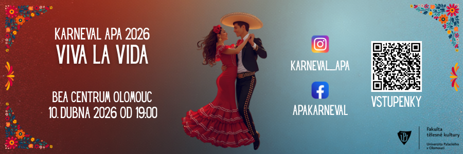Soutěžte o dva lístky na Karneval APAŠpanělské a mexické speciality, piñaty, stánek s hennou, kapelu Fantajm, vystoupení tanečníků Bílé holubice nebo vyhlášení krále a královny slibuje program Karnevalu APA, který v režii studentů katedry aplikovaných pohybových aktivit FTK UP v pátek 10. dubna ovládne BEA centrum Olomouc. Večer plný barev si s trochou štěstí můžete užít jen za jednu zprávu. Stačí, když do čtvrtka 2. dubna napíšete na Instagram či Facebook akce, jaký kostým si plánujete vzít na sebe, a dva VIP lístky můžou být vaše. |