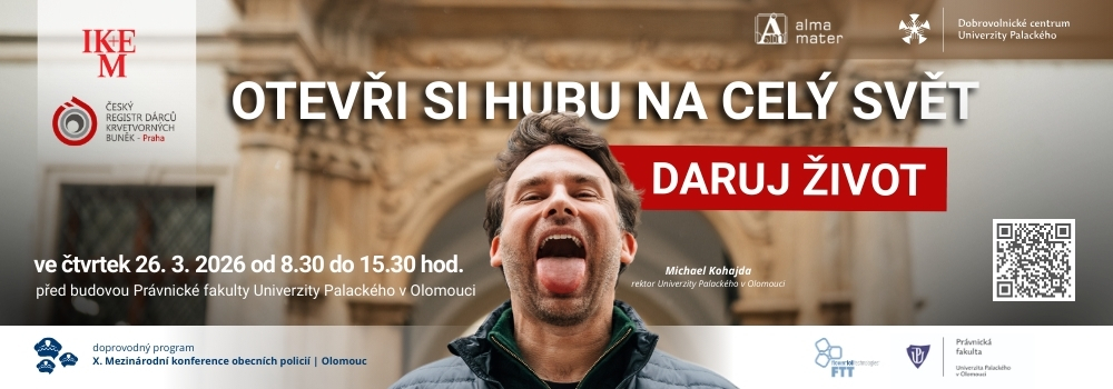 Otevři si hubu na celý svět a daruj život!Otevři si hubu na celý svět. Daruj život. Pod tímto sloganem bude ve čtvrtek 26. března před budovou Právnické fakulty UP opět probíhat náborová kampaň Českého registru dárců krvetvorných buněk při IKEM na podporu dárcovství krvetvorných buněk. Tváří kampaně se stal i rektor Michael Kohajda. Přijďte se v čase 8.30–15.30 zapsat a třeba jednou někomu zachráníte život – základní kritéria jsou: věk maximálně čtyřicet let, perfektní zdravotní stav, bez zdravotních obtíží a stálé medikace, s váhou nad 50 kg. |