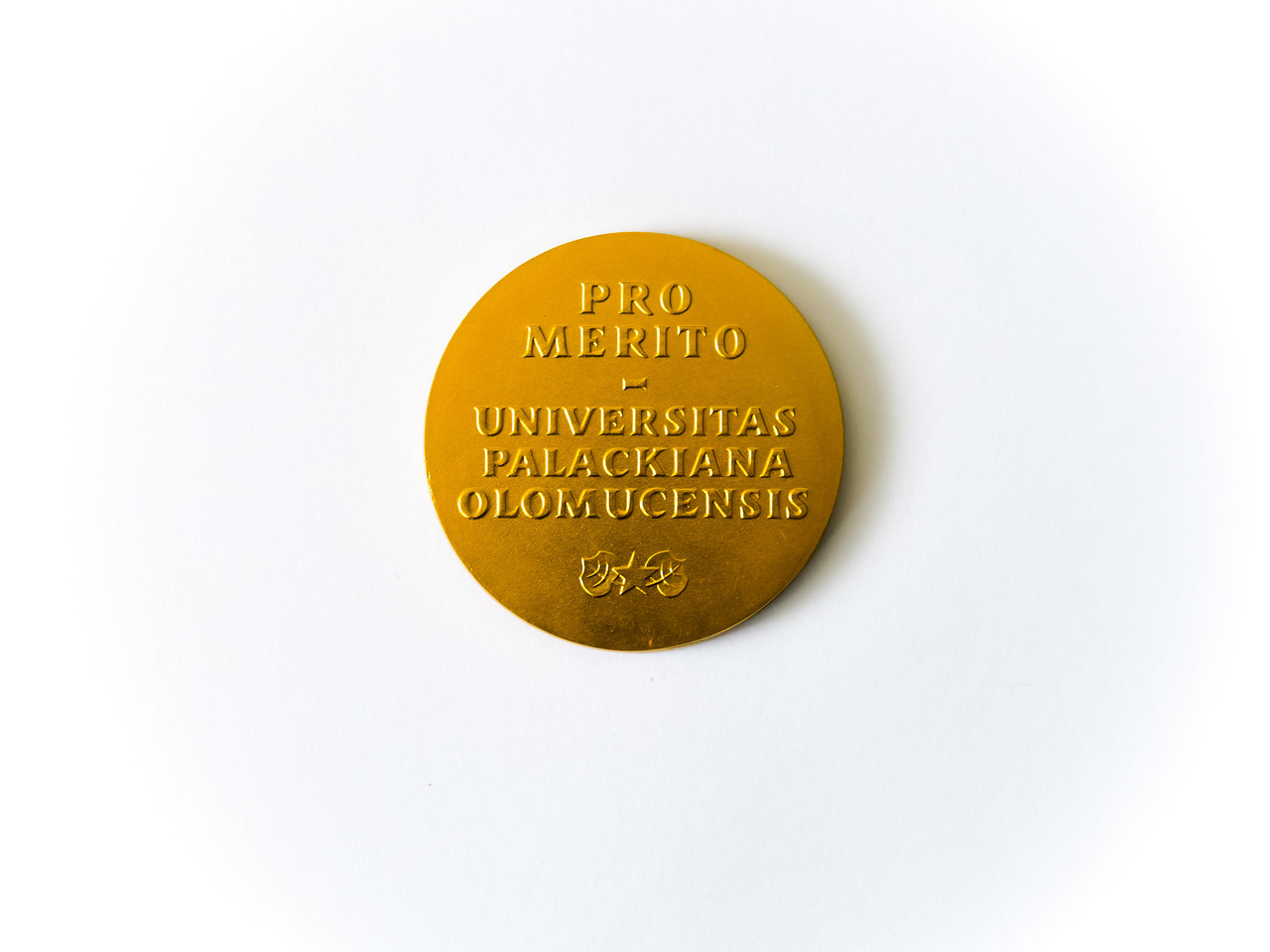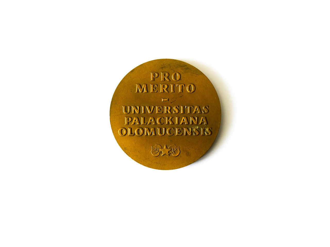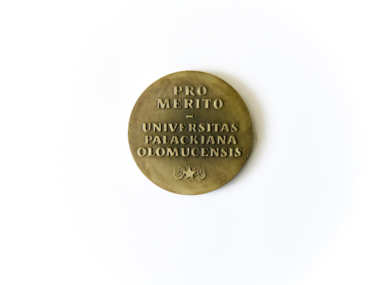 revers: pětiřádkový nápis nahoře PRO / MERITO / - / UNIVERSITAS / PALACKIANA / OLOMUCENSIS ukončený pěticípou hvězdičkou mezi dvěma lipovými listy