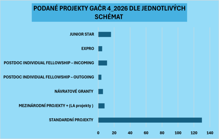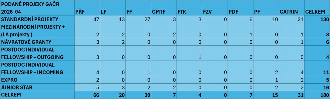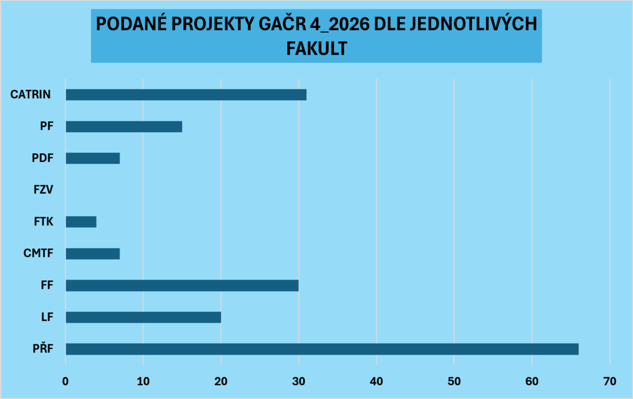 On April 20, 2026, the Grant Agency of the Czech Republic (GA ČR) closed the call for project proposals for the Standard Projects, International Projects, POSTDOC INDIVIDUAL FELLOWSHIP, Return Grants, EXPRO, and Junior STAR competitions. Palacký University submitted a total of 180 project applications to these calls. The majority of these, 66, were prepared by researchers from the Faculty of Science, followed by the CATRIN Research Institute (31) and the Faculty of Arts (30). You can view a clear summary of the submitted projects in the attached graphic.
