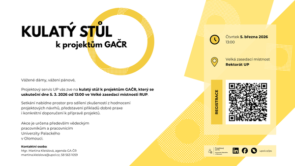 The UP Project Service invites you to a round table discussion on GAČR projects, which will take place on March 5, 2026, at 1:00 p.m. in the Large Meeting Room of the RUP.