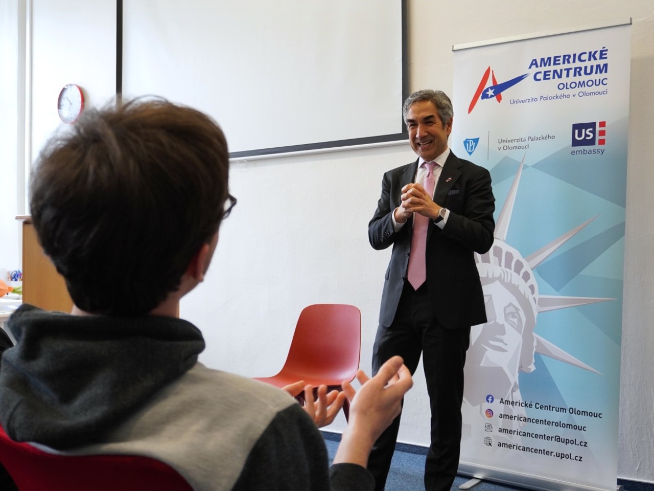 After the Rector’s Office, Sabet traveled to the American Center, which opened its premises last year at 8 tř. Svobody Avenue, where students from Olomouc’s Čajkovského high school awaited him. The students were interested not only whether the ambassador had learned some Czech, but also whom or what he missed being away from home. The ambassador spoke on a broad range of topics, from the possibilities of studying in the USA to the economic growth of China. “Meeting young people has always charged me with positive energy. You asked me some pretty tough questions, for which I truly thank you. And I’m keeping my fingers crossed for your further education,” the ambassador told the audience, which included his wife Lauren.
