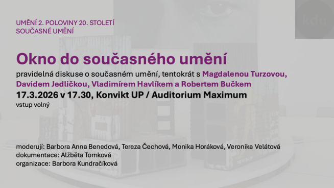 První z cyklu diskusí věnovaných současnému umění, které moderují studenti Katedry dějin umění FF UP, proběhne v úterý 17.3. od 17.30 v Auditoriu Maximu. Pozvání přijali malíři Magdalena Turzová a David Jedlička, performer Vladimír Havlík a sochař Robert Buček, kteří v Olomouci dlouhodobě působící také pedagogicky. Diskuse navazuje na projekt Umění v novém světě.