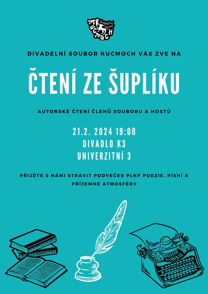 Divadelní soubor Kucmoch srdečně zve na literárně hudební pořad Čtení ze šuplíku. Během večera zazní autorské básně, písně a povídky našich členů. Jako zvláštní host vystoupí havířovský poeta Ivan Rybařík.