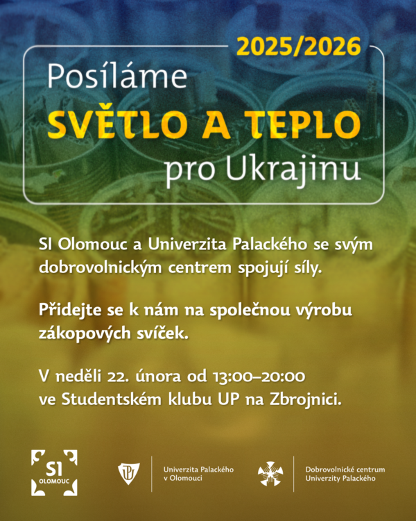 Obyvatelé Ukrajiny prožívají už pátou válečnou zimu. Cílené ruské útoky na energetickou infrastrukturu připravují místní o elektřinu a plyn. Univerzita Palackého proto spojila síly s olomouckými skauty a v neděli 22. 2. od 13:00 do 20:00 budeme ve Studentském klubu UP ve Zbrojnici společně vyrábět zákopové svíčky. Jediná plechovka vydrží hořet dlouhé hodiny, zvládne vytopit celou místnost, ohřát jídlo nebo posloužit jako zdroj světla. Vezměte spolužáky, přátele i děti a pojďte svou prací vrátit teplo tam, kde se ho lidem kvůli válce nedostává.