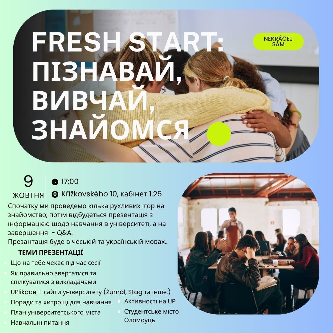 Akce se skládá z několika částí - aktivity na odbourání zábran a vytvoření bezpečného prostoru, informační prezentace a následné Q&A. Akce má za cíl pomoci ukrajinským studentům se lépe adaptovat do univerzitního života zde v Olomouci, mimo univerzitní záležitosti budou účastníkům poskytnuty i praktické informace ohledně života v Olomouci.