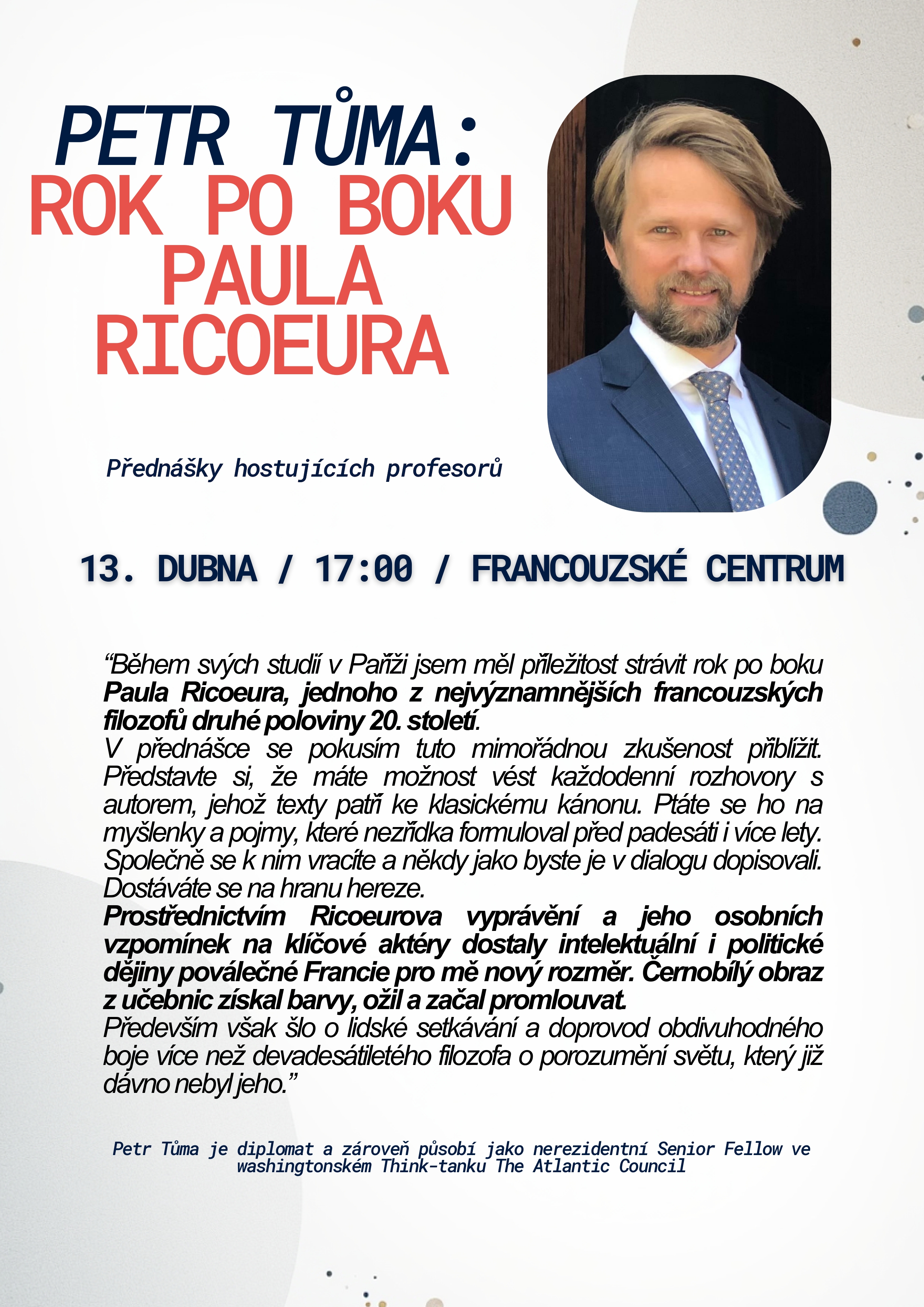 Platforma Pink Box a Francouzské centrum UP vás srdečně zvou na vernisáž výstavy "Filozofujme!". V rámci vernisáže proběhne také přednáška diplomata Petra Tůmy, který promluví o roce stráveném po boku filozofa Paula Ricoeura. Dalšími hosty budou zakladatelé platformy Pink Box.