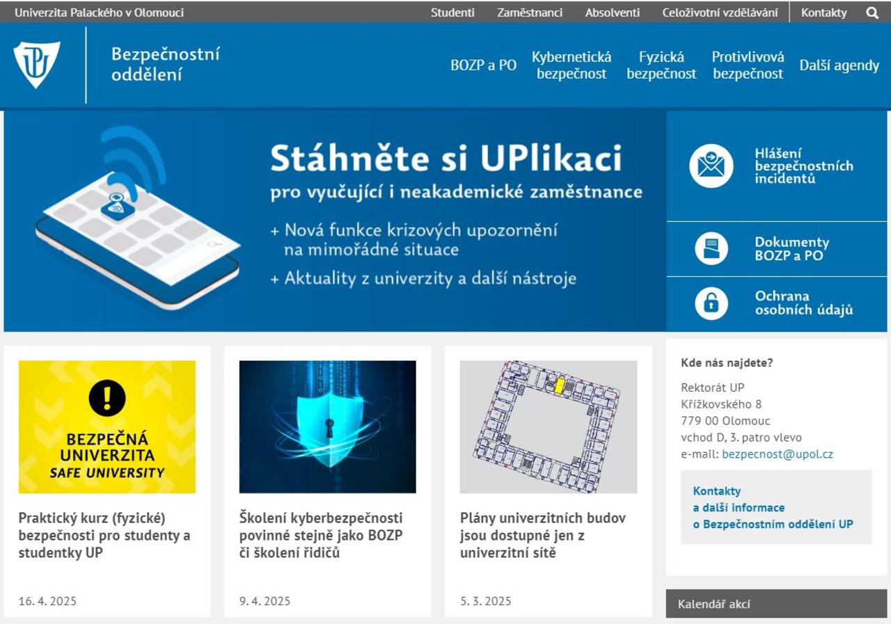Víte, kde najdete tiskopis pro záznam o úrazu, únikový plán rektorátu nebo krizové telefonické kontakty na UP? Na novém webu bezpečnostního oddělení.