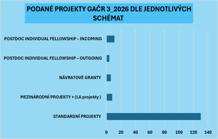 Největší podíl podaných projektů tradičně připadá na kategorii Standardní projekty (130), jejichž prostřednictvím je podporován excelentní základní výzkum ve všech oblastech. Ostatní schémata – mezinárodní projekty (+LEAD Agency projekty), návratové granty a postdoktorské fellowshipy – tvoří menší, avšak strategicky významnou část portfolia podaných projektů. Ve srovnání s předchozím rokem evidujeme pokles počtu podaných návrhů v kategorii mezinárodních projektů včetně projektů hodnocených na principu Lead Agency.