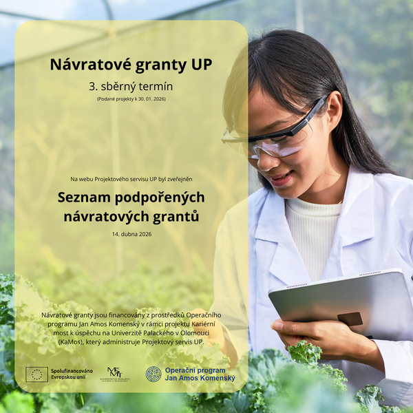 Financování návratových grantů je zajištěno v rámci rozpočtu projektu OP JAK Kariérní most k úspěchu na Univerzitě Palackého v Olomouci (KaMos), reg. č. CZ.02.01.01/00/24_037/0013751.