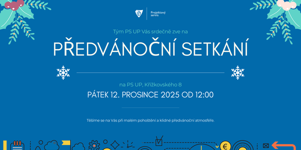 Tým Projektového servisu UP Vás zve na předvánoční setkání, které se uskuteční v pátek 12. prosince 2025 od 12:00 v prostorách rektorátu (1. patro budovy D). Přijďte se na chvíli zastavit, popovídat si a užít si klidnou adventní atmosféru u malého pohoštění.