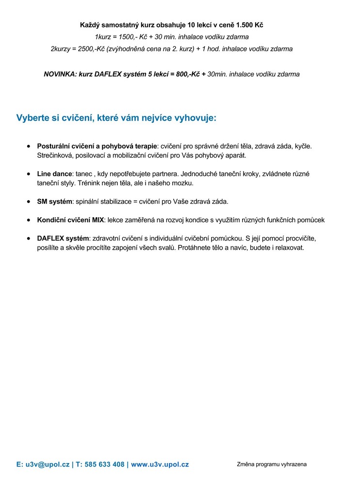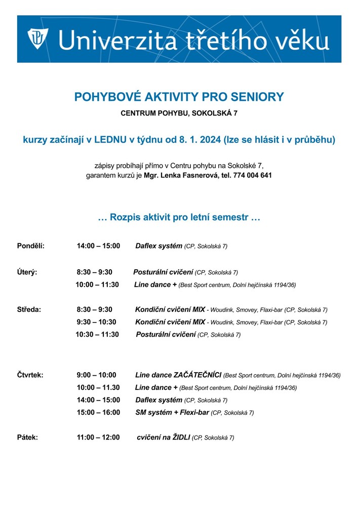 Široká nabídka různých typů cvičení na vás čeká v Centru pohybu v Olomouci. Vyberte si podle dne či typu cvičení, jež vám vyhovuje nejvíce. Začíná se už 8. ledna. Přihlašovat se však můžete ještě v průběhu celého ledna 2024.