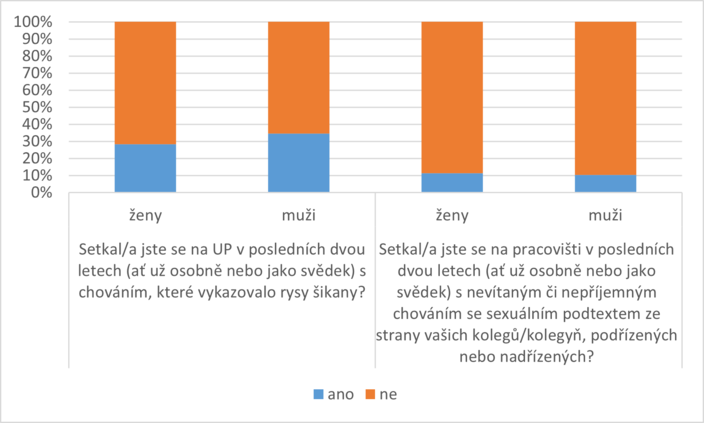 V dotazníku jsme se dále ptali i na případné zkušenosti s neetickým či nevhodným chováním na pracovišti. Z odpovědí vyplynulo, že nepatrně více se s nějakou formou šikany v práci setkali muži (35 %). S případy sexuálního obtěžování se setkalo shodně kolem 10 % respondentů.