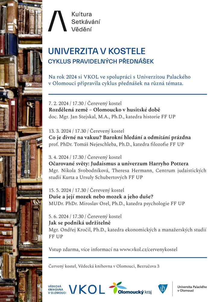 Na rok 2024 si VKOL ve spolupráci s Univerzitou Palackého v Olomouci připravila cyklus přednášek na různá témata. Vstup je zdarma a více informací najdete na www.vkol.cz/cervenykostel