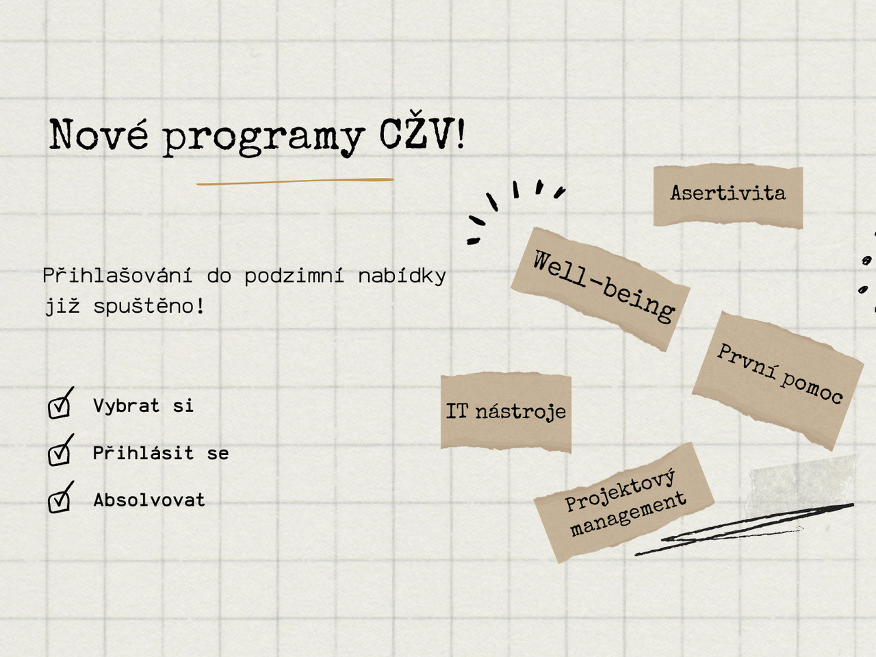 s nadcházejícím podzimem se opět můžete těšit na pestrou nabídku programů CŽV, které pro zaměstnance a doktorandy zůstávají nadále zdarma!