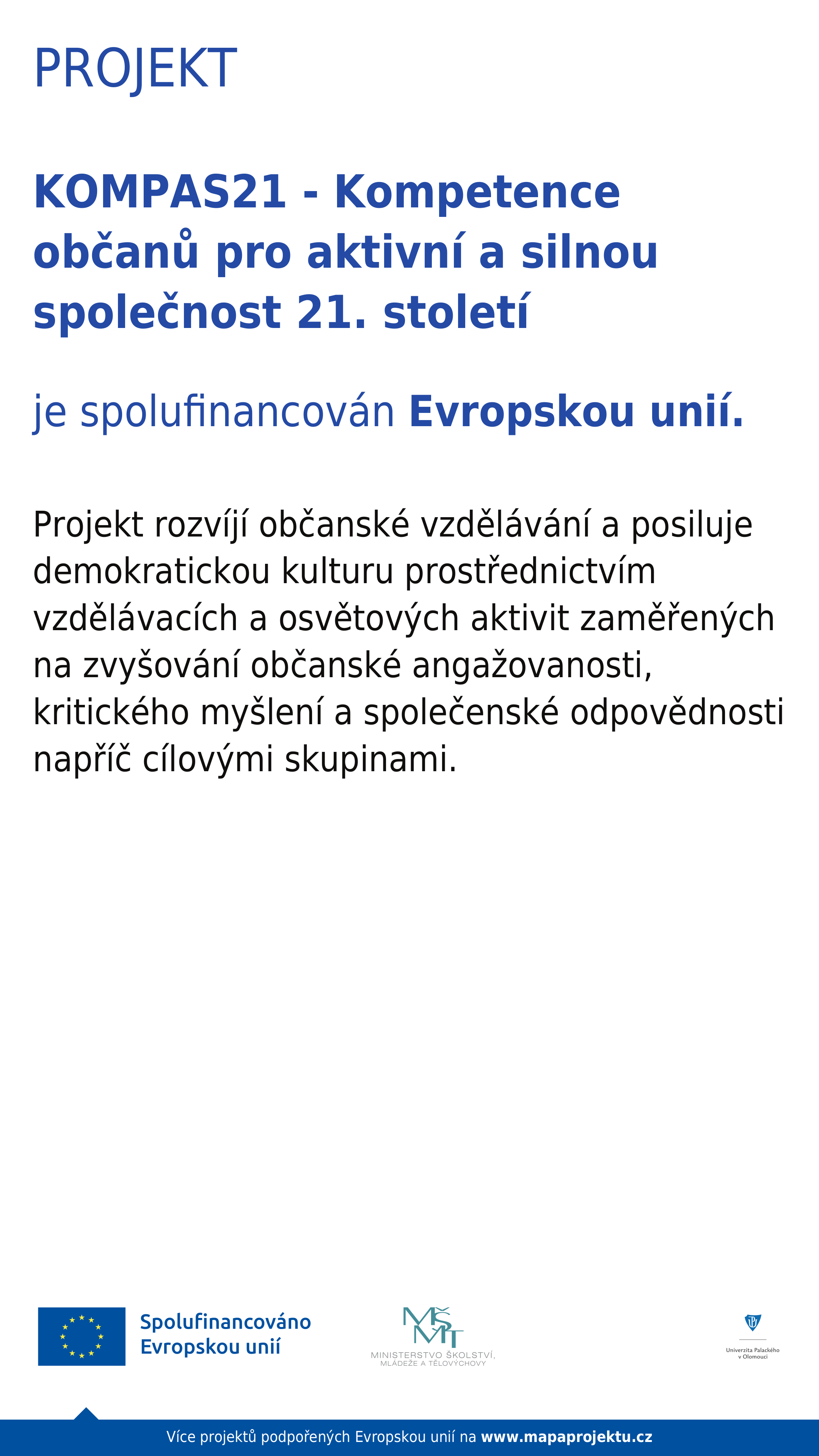 Projektu KOMPAS21 - Kompetence občanů pro aktivní a silnou společnost 21. století se zaměřuje na realizaci různých typů osvětových akcí pro širokou veřejnost, které budou podporovat zvýšení odolnosti společnosti proti vnějším a vnitřním hrozbám, podpoří zájem občanů o účast v participativních procesech a přispějí k prevenci negativních jevů ve společnosti. Jeho posláním je symbolicky představovat kompas, který občanům pomáhá hledat směr v demokratické společnosti, posilovat jejich kompetence a nacházet cestu k aktivní participaci a odpovědnému občanství.