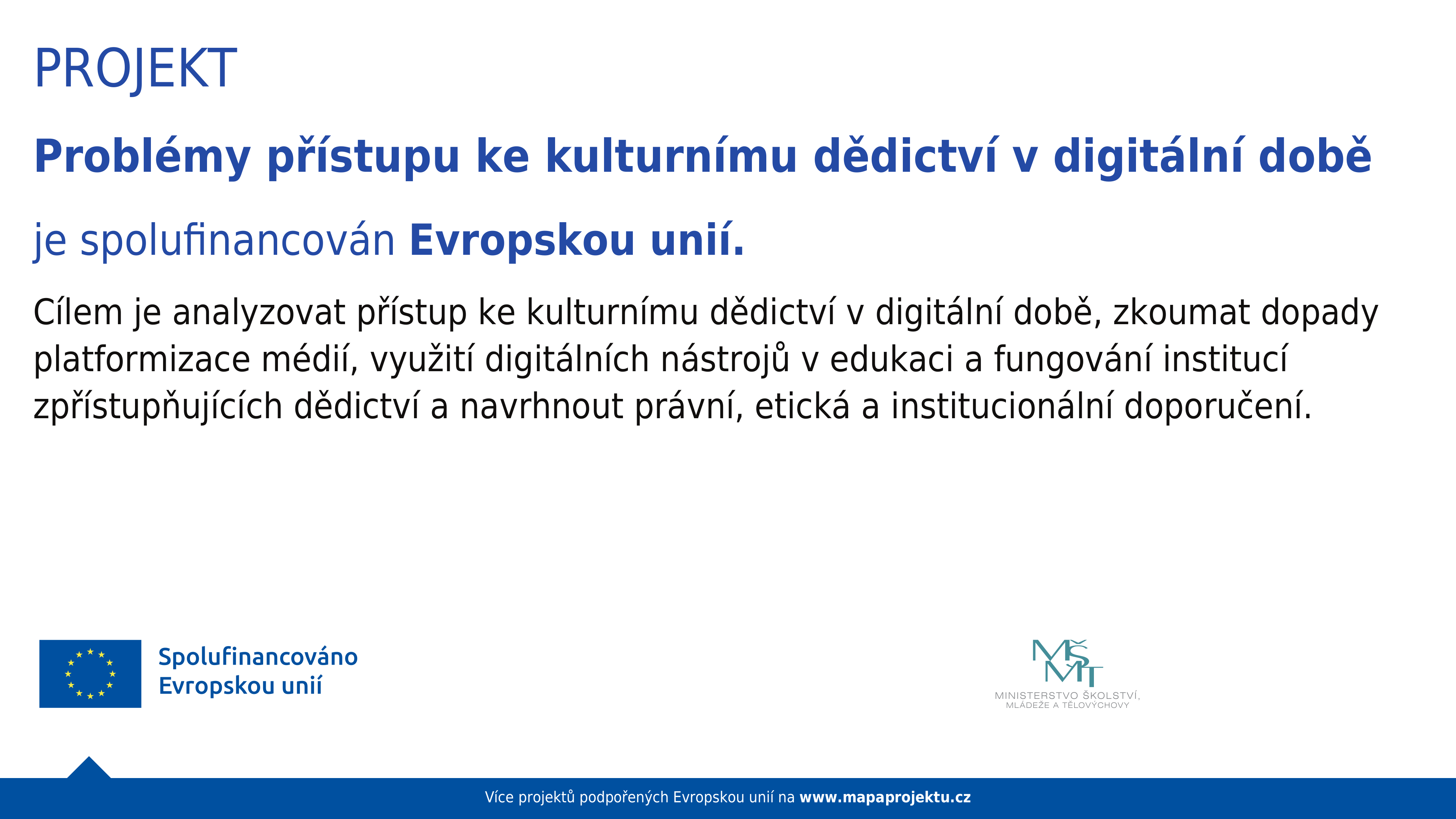 Projekt Problémy přístupu ke kulturnímu dědictví v digitální době se zaměřuje na příležitosti, problémy a konflikty vznikající v důsledku digitalizace a platformizace přístupu ke kulturnímu dědictví. Zkoumá režimy zviditelňování kulturního obsahu v nabídce globálních streamingových služeb, účinky digitálních nástrojů pro zpřístupňování kulturního dědictví ve vzdělávání, organizační kulturu institucí zajišťujících přístup ke kulturnímu dědictví a normativní problémy spojené s přístupem ke kulturním statkům.
