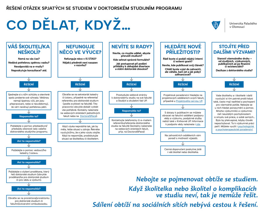 Nemá na vás váš/vaše školitel/ka čas? Nedává vám potřebnou zpětnou vazbu, neodpovídá na e-maily, neposkytuje konzultace? Nefunguje něco ve výuce, v IS STAG, nějaký předmět není nasazen v rozvrhu? Nevíte, co musíte udělat, abyste přerušili studium, kde sehnat správné formuláře nebo jak postupovat při podání přihlášky k obhajobě disertace a státní doktorské zkoušce? Rádi byste si podali nějaký interní či externí grant? Nevíte, kde publikovat svůj článek? Chtěli byste vyjet do zahraničí, ale váháte, kam jet a jak pobyt zafinancovat?