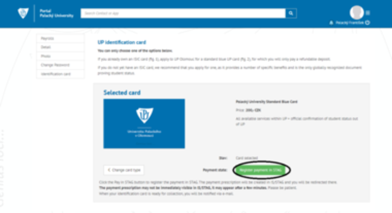 For employees, your identification card will be issued to you by the UP Computer Centre (CVT) no earlier than 24 hours after signing the employment contract. To issue the card, you will need an ID card and a high-quality 35×45 mm photo, which can be sent electronically. To expedite the issue of the card, ask your contact person to send the photo in advance and verify the processing status of the card. There is a limited amount of money on your card (to be used at university facilities) and when you exceed the limit, any further payments will be deducted from your wage. After clicking register payment in STAG, you will be redirected to a payment gateway in STAG where you will pay for the selected card. Please note that the payment order may not be visible immediately.